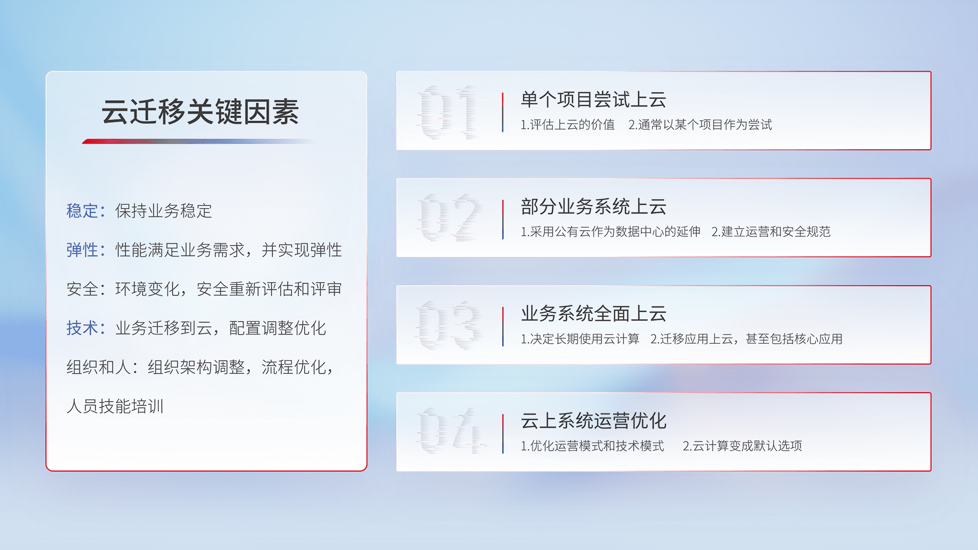 结合实际业务,,,,从规划设计、、、、云平台选型、、云原生改造、、、、数据迁移、、、、集成交付,,迁移全过程为客户识别最佳上云路径,,,做好风险识别管理,,设计网络架构、、身份权限、、安全审计合规、、操作审计、、日志审计、、、监控告警策略、、、多站点容灾设计等,,对云上基础设施进行整体规划,,,,提升IT治理水平,,以满足弹性、、高可用、、、、高性能的需求。。